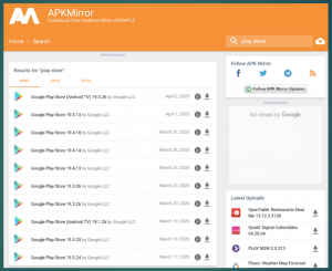 구글 플레이 스토어 다시 설치하기: 두 번째 방법 첫 번째가 도움이 되지 않는 경우 직접 다운하는것만 남습니다. 그러나 이 방법은 조심해야 합니다. 왜냐하면 악성 코드가 포함될 수 있기 때문입니다. 따라서 신뢰할 만한 웹사이트를 이하는 것이 좋습니다. APK Mirror와 같은 사이트가 적절한 선택일 것입니다.