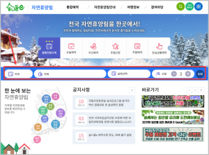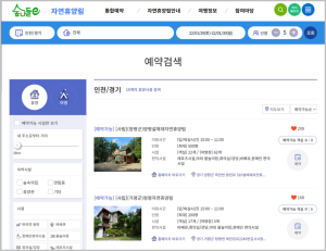 ‘자연휴양림 예약정보시스템’을 통해 많은 정보를 얻을 수 있으며, 여기에서 예약도 가능합니다.. 네이버나 다음에서 ‘숲나들e’로 검색하면 해당 시스템에 쉽게 접속할 수 있습니다.