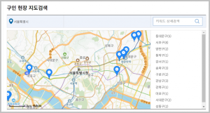 서울 지역에서 일할 인력을 모집하는 곳의 위치를 보여주는 지도를 홈페이지에서 확인할 수 있습니다. 위 화면에 표시한 것 과 같이 구인 현장 지도검색을 클릭하면 맵화면을 통해 확인할 수있습니다. 이러한 서비스 집 근처나 교통이 편리한 지역에서 일자리를 찾는 것이 유리합니다. 이러한 지도 서비스는 매우 유용합니다.